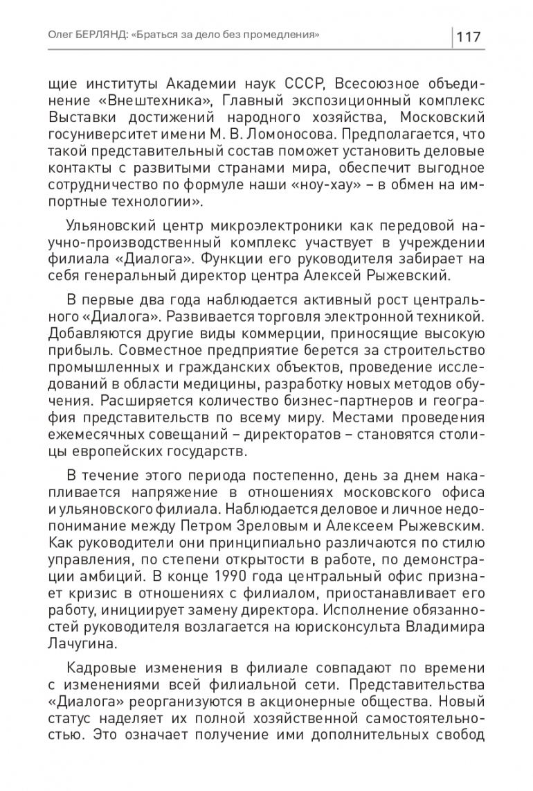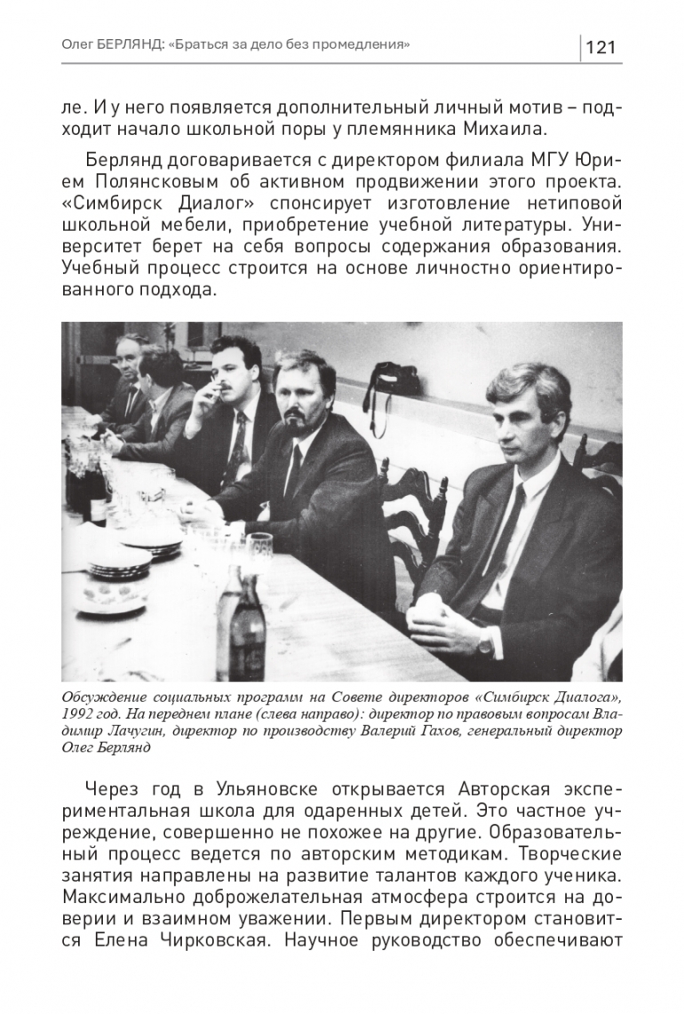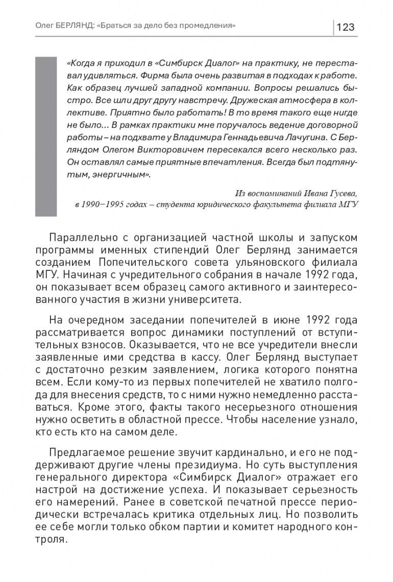 «Когда я приходил в «Симбирск Диалог» на практику, не переставал удивляться. Фирма была очень развитая в подходах к работе. Как образец лучшей западной компании. Вопросы решались быстро. Все шли друг другу навстречу. Дружеская атмосфера в коллективе. Приятно было работать! В то время такого еще нигде не было... В рамках практики мне поручалось ведение договорной работы – на подхвате у Владимира Геннадьевича Лачугина. С Берляндом Олегом Викторовичем пересекался всего несколько раз. Он оставлял самые приятные впечатления. Всегда был подтянутым, энергичным». Из воспоминаний Ивана Гусева, в 1990−1995 годах – студента юридического факультета филиала МГУ