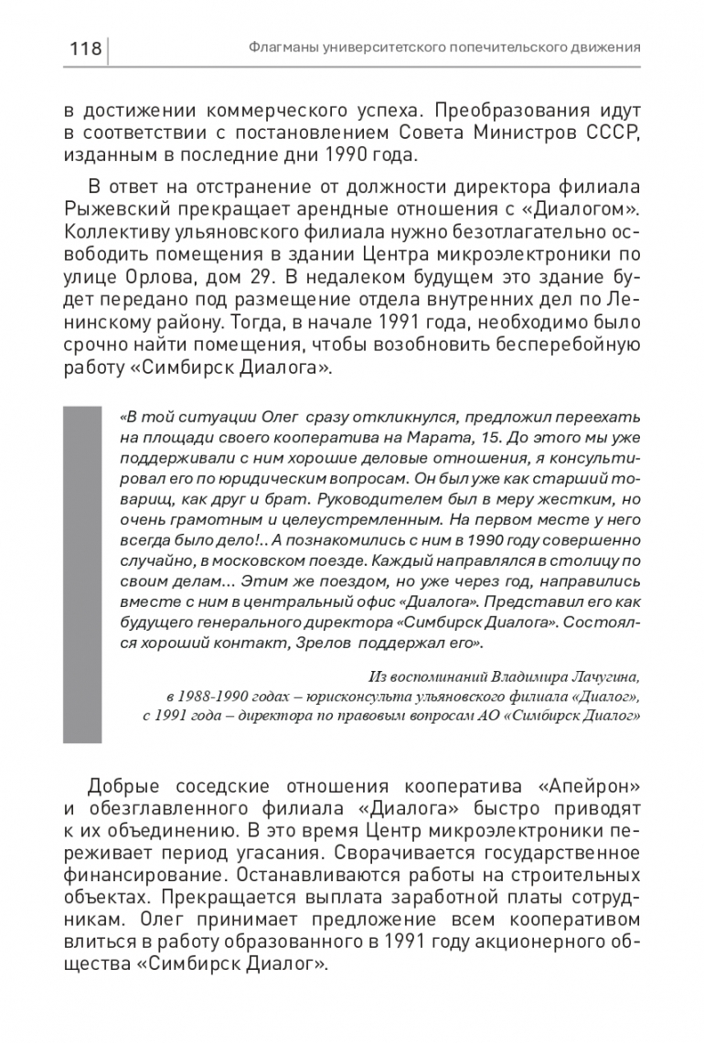 «В той ситуации Олег сразу откликнулся, предложил переехать на площади своего кооператива на Марата, 15. До этого мы уже поддерживали с ним хорошие деловые отношения, я консультировал его по юридическим вопросам. Он был уже как старший товарищ, как друг и брат. Руководителем был в меру жестким, но очень грамотным и целеустремленным. На первом месте у него всегда было дело!.. А познакомились с ним в 1990 году совершенно случайно, в московском поезде. Каждый направлялся в столицу по своим делам… Этим же поездом, но уже через год, направились вместе с ним в центральный офис «Диалога». Представил его как будущего генерального директора «Симбирск Диалога». Состоялся хороший контакт, Зрелов поддержал его». Из воспоминаний Владимира Лачугина, в 1988-1990 годах – юрисконсульта ульяновского филиала «Диалог», с 1991 года – директора по правовым вопросам АО «Симбирск Диалог»