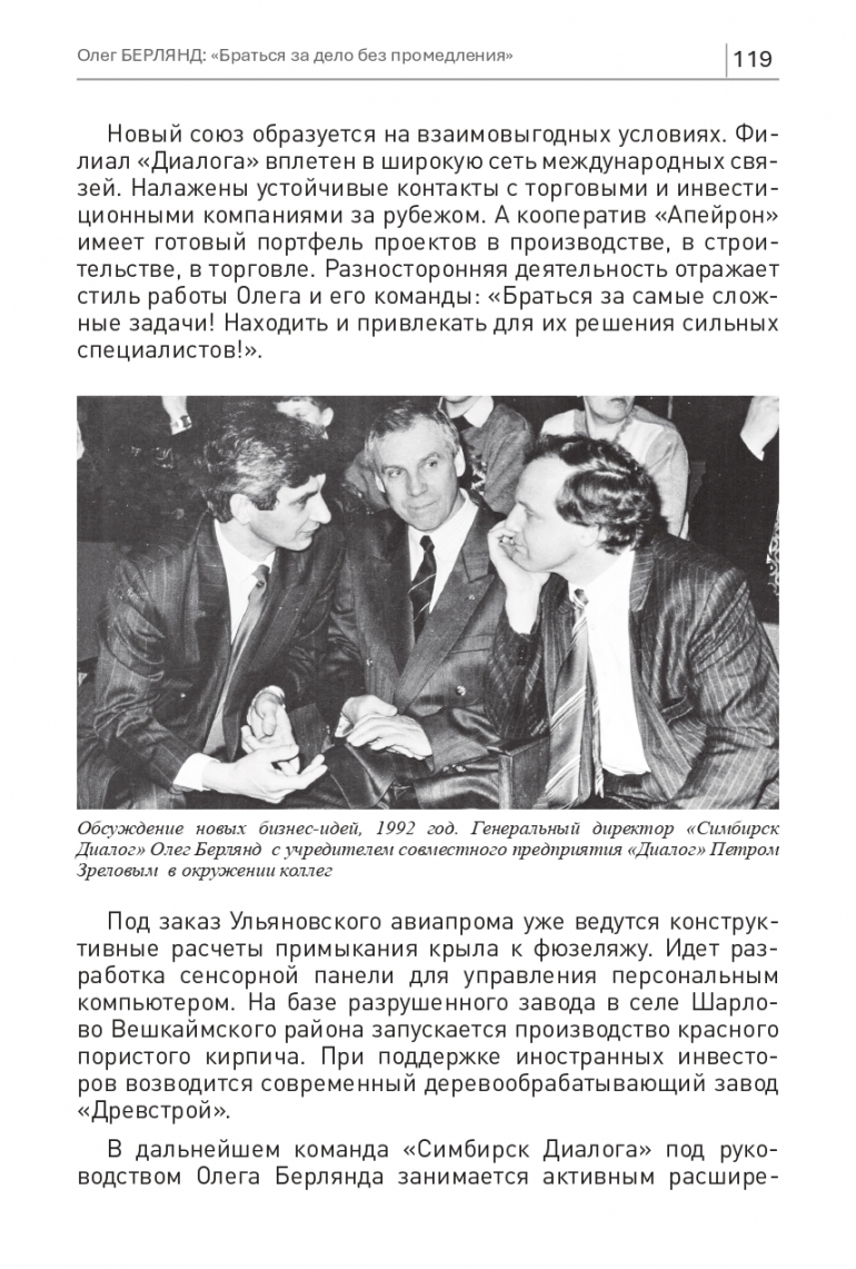 Новый союз образуется на взаимовыгодных условиях. Филиал «Диалога» вплетен в широкую сеть международных связей. Налажены устойчивые контакты с торговыми и инвестиционными компаниями за рубежом. А кооператив «Апейрон» имеет готовый портфель проектов в производстве, в строительстве, в торговле. Разносторонняя деятельность отражает стиль работы Олега и его команды: «Браться за самые сложные задачи! Находить и привлекать для их решения сильных специалистов!».