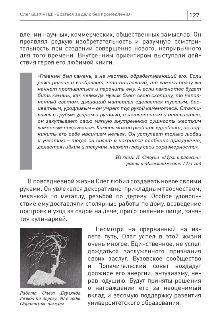 «Главным был камень, а не мастер, обрабатывающий его. Если даже резчик и вообразит, что он главный, то камень сразу же начнет противиться и перечить ему. А если каменотес будет бить камень, как невежда мужик бьет свою скотину, то наполненный светом, дышащий материал сделается тусклым, бесцветным, уродливым – он умрет под рукой каменотеса. Сталкиваясь с грубым ударом и руганью, с нетерпением и ненавистью, он закутывает свою мягкую внутреннюю сущность жестким каменным покрывалом. Камень можно разбить вдребезги, по подчинить его себе насилием нельзя. Он уступает только любви и участию – тогда он сияет и искрится особенно празднично, делается гибким и текучим, являет глазу свои соразмерности». Из книги И. Стоуна «Муки и радости: роман о Микеланджело», 1971 год