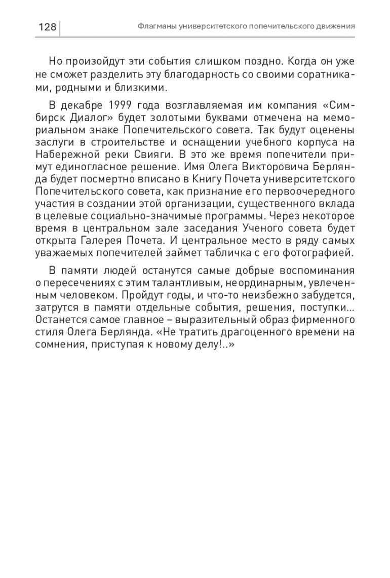В памяти людей останутся самые добрые воспоминания о пересечениях с этим талантливым, неординарным, увлеченным человеком. Пройдут годы, и что-то неизбежно забудется, затрутся в памяти отдельные события, решения, поступки… Останется самое главное – выразительный образ фирменного стиля Олега Берлянда. «Не тратить драгоценного времени на сомнения, приступая к новому делу!..»