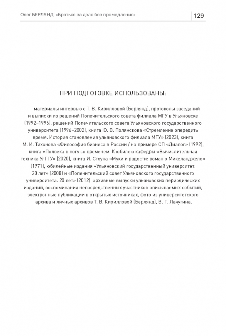 ПРИ ПОДГОТОВКЕ ИСПОЛЬЗОВАНЫ: материалы интервью с Т. В. Кирилловой (Берлянд), протоколы заседаний и выписки из решений Попечительского совета филиала МГУ в Ульяновске (1992−1996), решений Попечительского совета Ульяновского государственного университета (1996−2002), книга Ю. В. Полянскова «Стремление опередить время. История становления ульяновского филиала МГУ» (2023), книга М. И. Тихонова «Философия бизнеса в России / на примере СП «Диалог» (1992), книга «Полвека в ногу со временем. К юбилею кафедры «Вычислительная техника УлГТУ» (2020), книга И. Стоуна «Муки и радости: роман о Микеланджело» (1971), юбилейные издания «Ульяновский государственный университет. 20 лет» (2008) и «Попечительский совет Ульяновского государственного университета. 20 лет» (2012), архивные выпуски ульяновских периодических изданий, воспоминания непосредственных участников описываемых событий, электронные публикации в открытых источниках, фото из университетского архива и личных архивов Т. В. Кирилловой (Берлянд), В. Г. Лачугина.