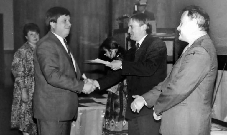 Вручение диплома в Академии народного хозяйства, 1994 год. Декан, профессор Александр Аверин напутствует выпускника Анатолия Шмелева