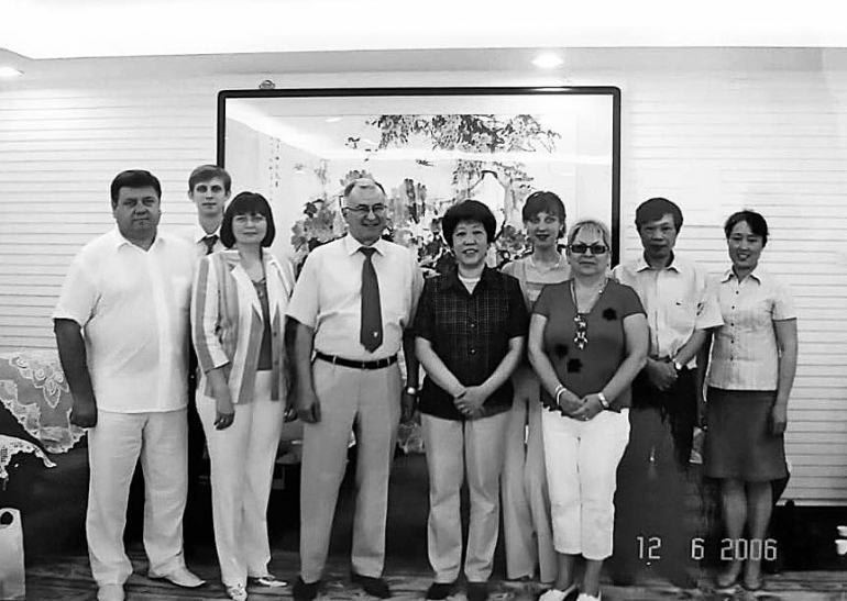 Попечители, члены комитета по внешним связям Анатолий Шмелев и Марина Беспалова, ректор Юрий Полянсков, проректор Татьяна Никитина с коллегами из китайского университета, 2006 год