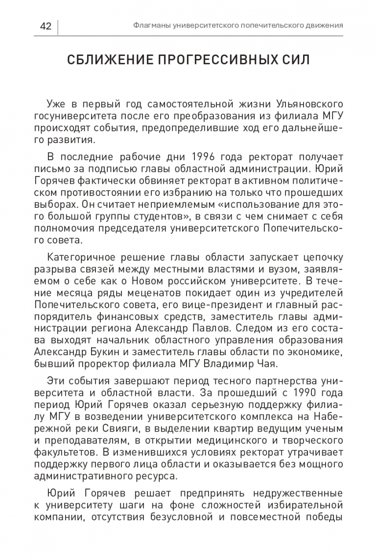 Уже в первый год самостоятельной жизни Ульяновского госуниверситета после его преобразования из филиала МГУ происходят события, предопределившие ход его дальнейшего развития. В последние рабочие дни 1996 года ректорат получает письмо за подписью главы областной администрации. Юрий Горячев фактически обвиняет ректорат в активном политическом противостоянии его избранию на только что прошедших выборах. Он считает неприемлемым «использование для этого большой группы студентов», в связи с чем снимает с себя полномочия председателя университетского Попечительского совета.