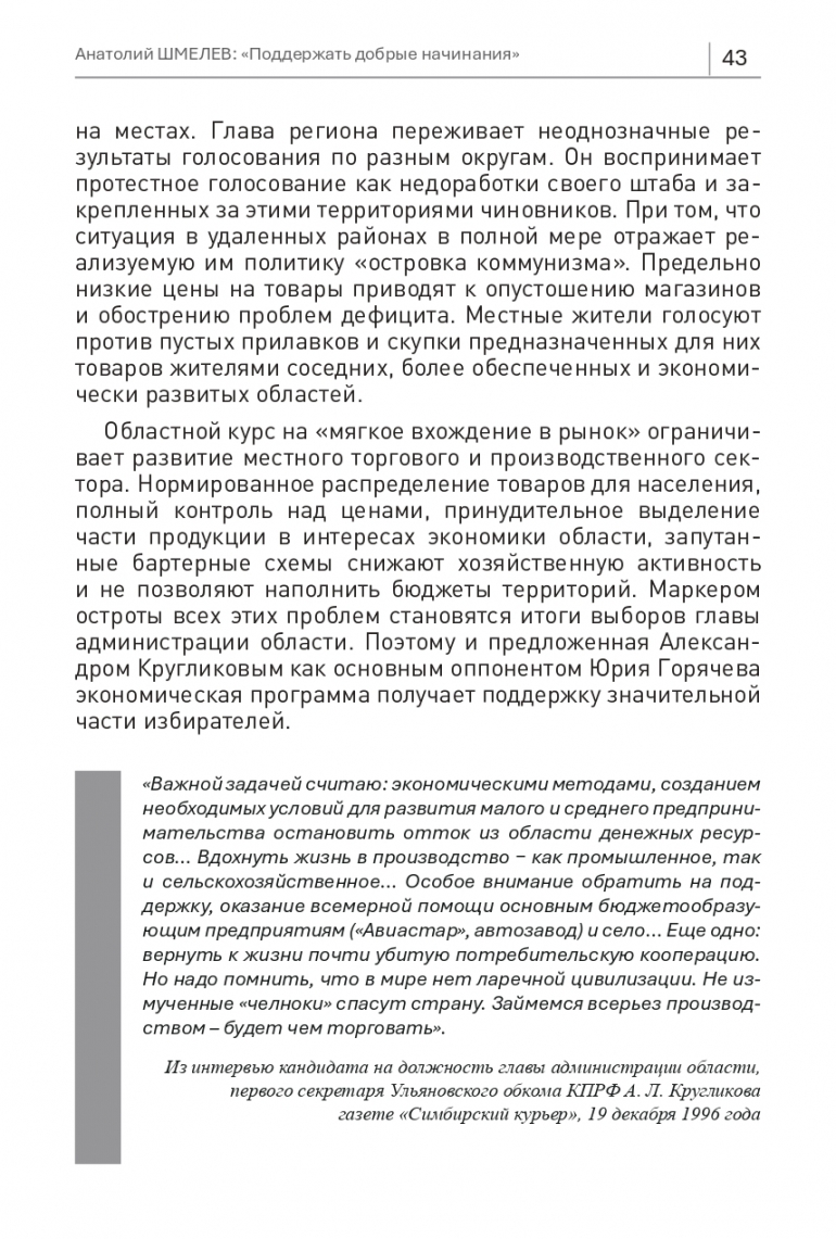 Областной курс на «мягкое вхождение в рынок» ограничивает развитие местного торгового и производственного сектора. Нормированное распределение товаров для населения,полный контроль над ценами, принудительное выделение части продукции в интересах экономики области, запутанные бартерные схемы снижают хозяйственную активность и не позволяют наполнить бюджеты территорий. Маркером остроты всех этих проблем становятся итоги выборов главы администрации области. Поэтому и предложенная Александром Кругликовым как основным оппонентом Юрия Горячева экономическая программа получает поддержку значительной части избирателей.