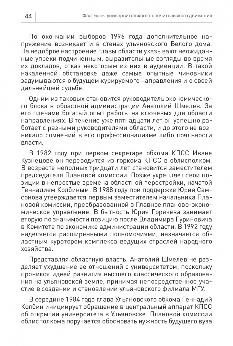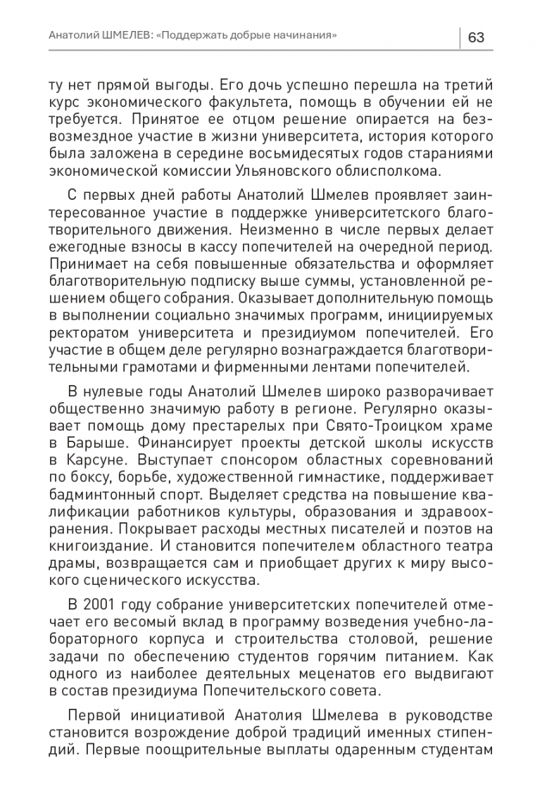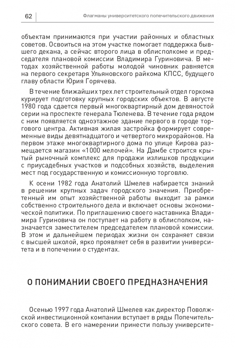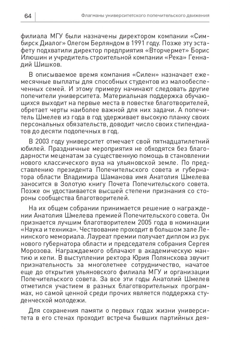 УлГУ презентовал книгу «Флагманы университетского попечительского движения». Ее автор первый ректор, а ныне президент вуза Юрий Полянсков. Издание вышло ограниченным тиражом и, чтобы как можно больше людей могли прочитать книгу, эксклюзивно на 73online.ru будут опубликованы все главы первого тома. Сегодняшняя посвящена строителю Анатолию Шмелеву, который обеспечивал возрождение университетского образования со стороны облисполкома и обкома КПСС. Он стал бессменным членом президиума Попечительского совета и автором ярких социальных инициатив.