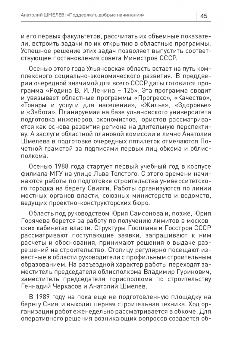 Осенью этого года Ульяновская область встает на путь комплексного социально-экономического развития. В преддверии очередной значимой для всего СССР даты готовится программа «Родина В. И. Ленина – 125». Эта программа сводит и увязывает областные программы «Прогресс», «Качество», «Товары и услуги для населения», «Жилье», «Здоровье» и «Забота». Планируемая на базе ульяновского университета подготовка инженеров, экономистов, юристов рассматривается как основа развития региона на длительную перспективу. А заслуги областной плановой комиссии и лично Анатолия Шмелева в подготовке очередных пятилеток отмечаются Почетной грамотой за подписями первых лиц обкома и облисполкома.