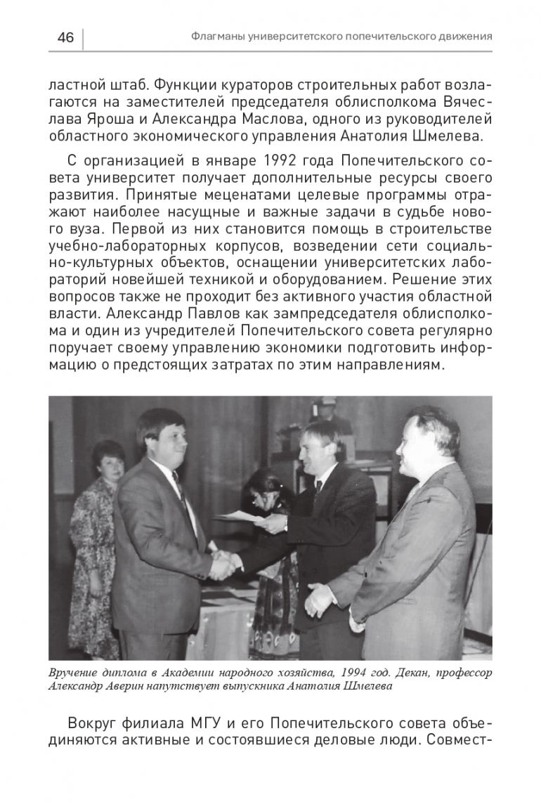 Вокруг филиала МГУ и его Попечительского совета объе-диняются активные и состоявшиеся деловые люди. Совместная работа сподвигает многих из них к дальнейшему профессиональному росту. В 1993 году Анатолий Шмелев поступает в Академию народного хозяйства при Правительстве России. Двухлетняя подготовка по программам работы в новых экономических условиях ведется без отрыва от основного местаработы. Через год Анатолий Шмелев получает престижную и пока еще редкую для региона квалификацию магистра государственного управления.