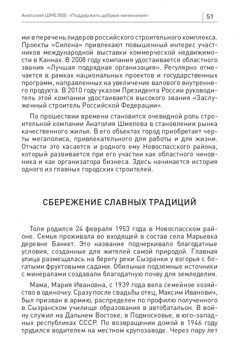 По прошествии времени становится очевидной роль строительной компании Анатолия Шмелева в становлении рынкака чественного жилья. В его объектах город приобретает черты мегаполиса, привлекательного для работы и для жизни. Отчасти это касается и родного ему Новоспасского района, который развивается при его участии как областного чиновника и как организатора бизнеса. Здесь начинается историяодного из главных городских строителей.