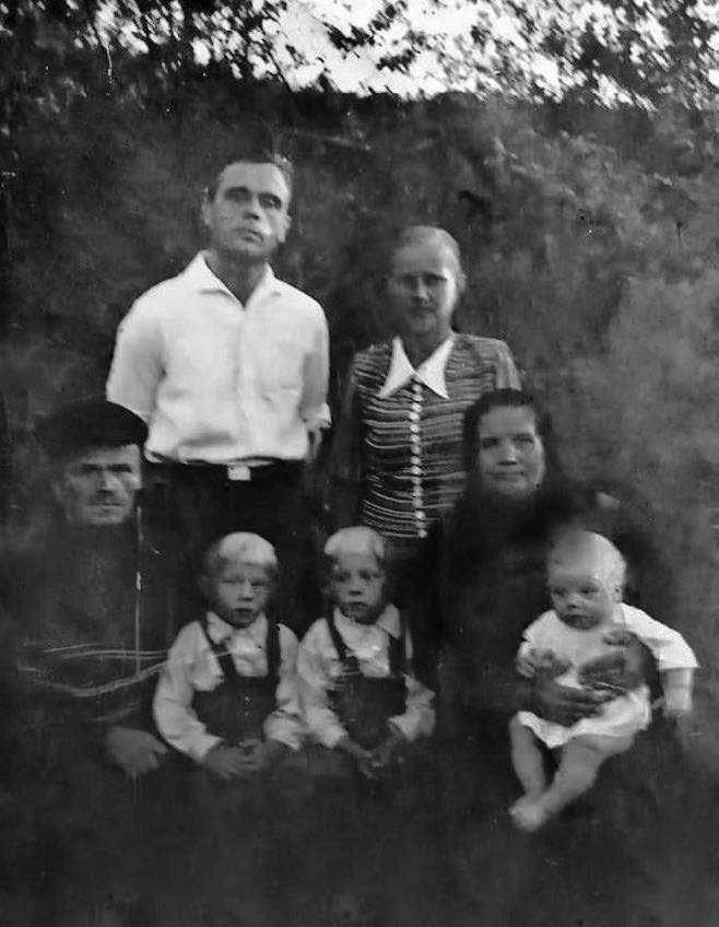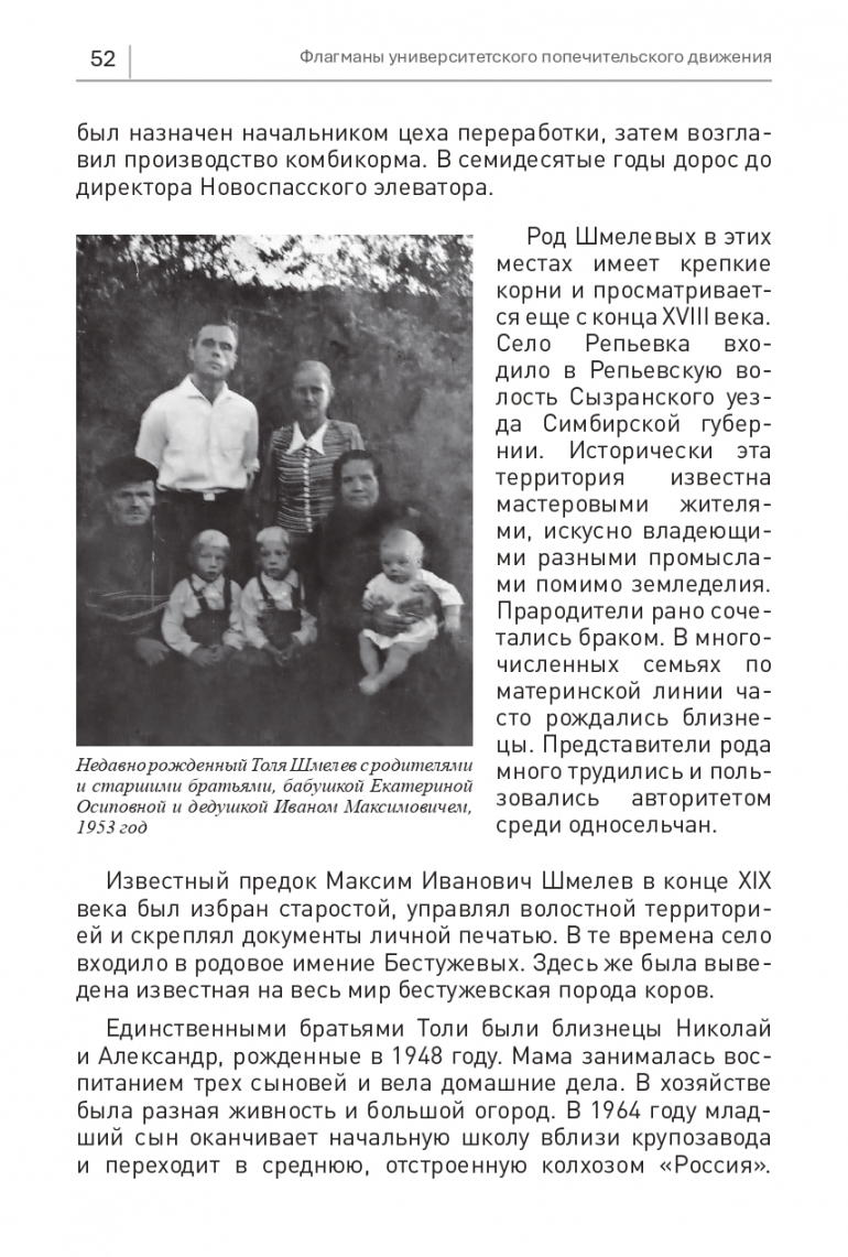 Недавно рожденный Толя Шмелев с родителямии старшими братьями, бабушкой Екатериной Осиповной и дедушкой Иваном Максимовичем, 1953 год