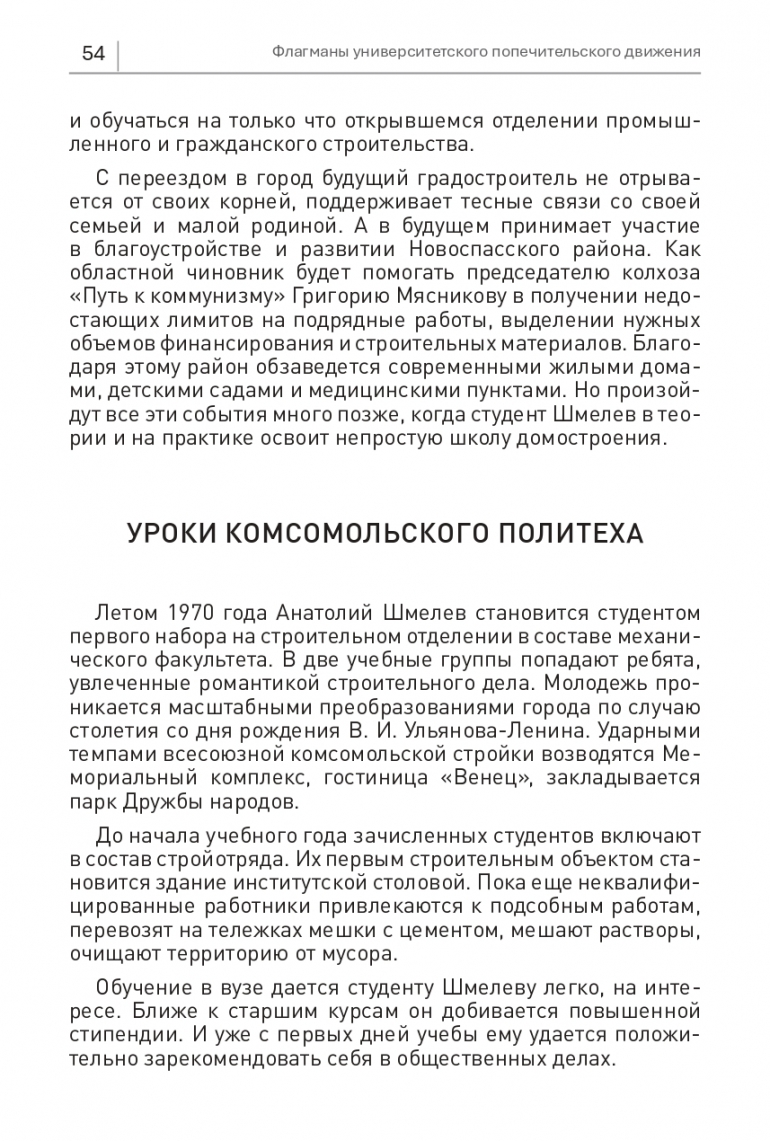 Летом 1970 года Анатолий Шмелев становится студентом первого набора на строительном отделении в составе механического факультета. В две учебные группы попадают ребята, увлеченные романтикой строительного дела. Молодежь проникается масштабными преобразованиями города по случаю столетия со дня рождения В. И. Ульянова-Ленина. Ударными темпами всесоюзной комсомольской стройки возводятся Мемориальный комплекс, гостиница «Венец», закладывается парк Дружбы народов.