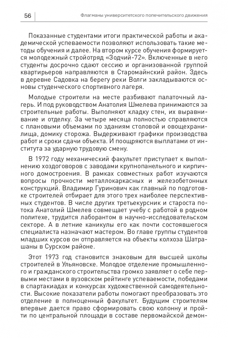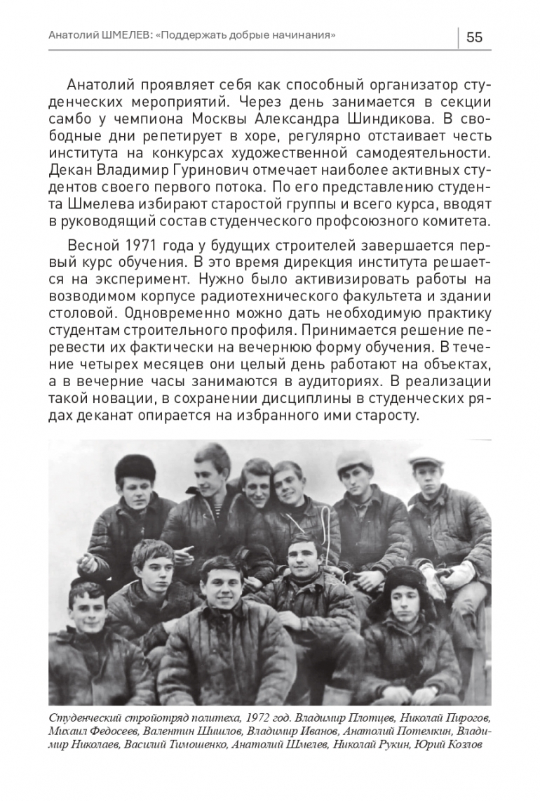 В 1972 году механический факультет приступает к выполнению хоздоговоров с заводами крупнопанельного и кирпичного домостроения. В рамках совместных работ изучаются вопросы прочности металлокаркасных и железобетонных конструкций. Владимир Гуринович как главный по подготовке строителей отбирает для этого трех наиболее перспективных студентов. В числе других третьекурсник и староста потока Анатолий Шмелев совмещает учебу с работой в родномполитехе, трудится лаборантом в научно-исследовательском секторе. А в летние каникулы его как почти состоявшегося специалиста назначают мастером. Во главе группы студентов младших курсов он отправляется на объекты колхоза Шатрашаны в Сурском районе.
