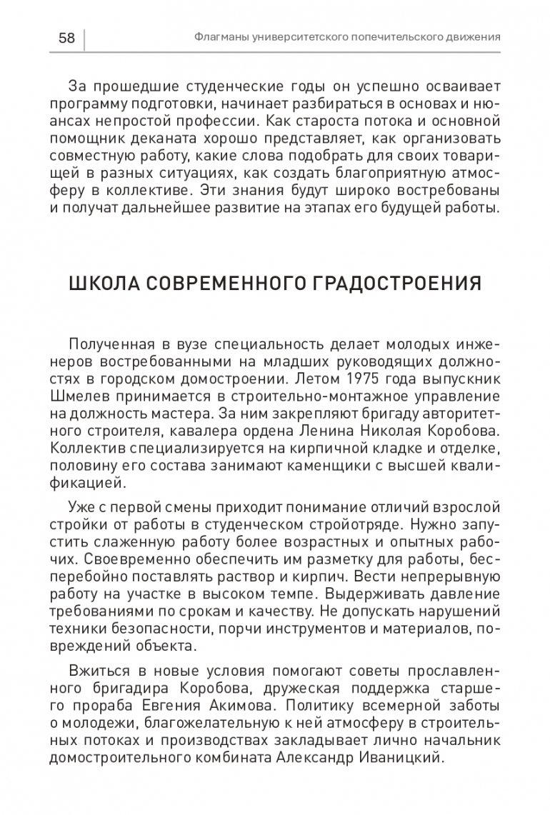 Полученная в вузе специальность делает молодых инженеров востребованными на младших руководящих должностях в городском домостроении. Летом 1975 года выпускник Шмелев принимается в строительно-монтажное управление на должность мастера. За ним закрепляют бригаду авторитетного строителя, кавалера ордена Ленина Николая Коробова. Коллектив специализируется на кирпичной кладке и отделке, половину его состава занимают каменщики с высшей квалификацией.