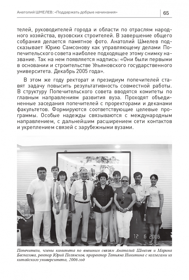 Для сохранения памяти о первых годах жизни университета в его стенах проходит встреча бывших партийных деятелей, руководителей города и области по отраслям народного хозяйства, вузовских строителей. В завершение общего собрания делается памятное фото. Анатолий Шмелев подсказывает Юрию Самсонову как управляющему делами Попечительского совета наиболее подходящее этому снимку название. Так на нем появляется надпись: «Они были первыми в основании и строительстве Ульяновского государственного университета. Декабрь 2005 года».