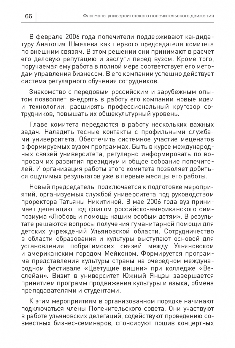 К этим мероприятиям в организованном порядке начинают подключаться члены Попечительского совета. Они участвуют в работе ульяновских делегаций, содействуют проведению совместных бизнес-семинаров, спонсируют пошив концертных платьев для университетского хора и ансамблей русского народного танца, оплачивают участие молодых ульяновских артистов в зарубежных фестивалях. При их поддержке университет расширяет международное направление работы, развивает новые связи с университетами США, Южной Кореи и Китая.