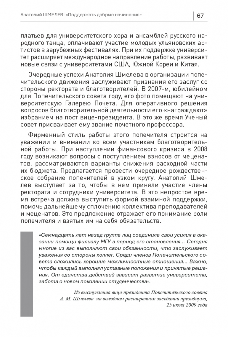 «Семнадцать лет назад группа лиц соединила свои усилия в оказании помощи филиалу МГУ в период его становления… Сегодня многие из вас выполняют свои обязанности, что заслуживает уважения со стороны коллег. Среди членов Попечительского совета сложились хорошие межличностные отношения… Важно, чтобы каждый выполнял уставные положения и принятые решения. От единства действий зависит развитие университета, забота о новом поколении студенчества». Из выступления вице-президента Попечительского советаА. М. Шмелева на выездном расширенном заседании президиума,25 июня 2009 года