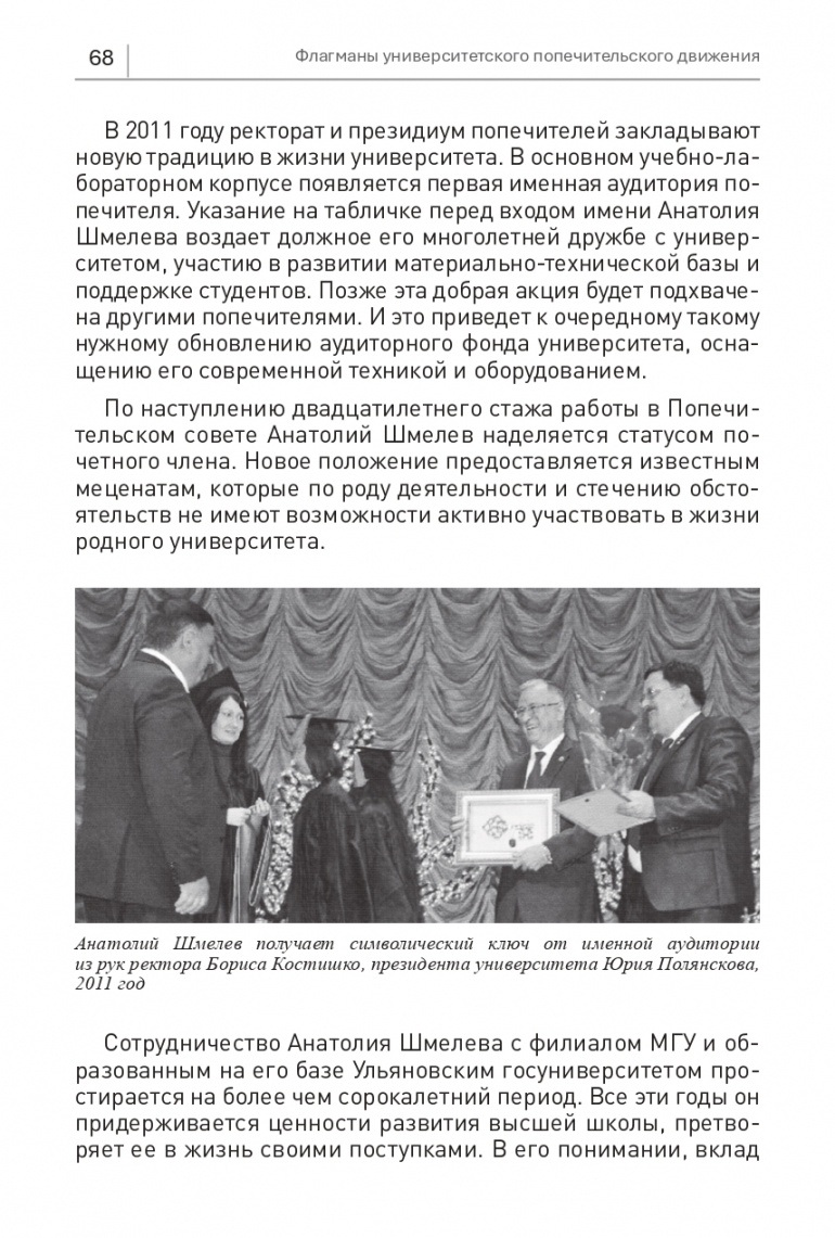 На их общем собрании принимается решение о награждении Анатолия Шмелева премией Попечительского совета. Он признается лучшим благотворителем 2005 года в номинации «Наука и техника». Чествование проходит в большом зале Ленинского мемориала. Лауреат премии получает диплом из рук нового губернатора области и председателя собрания Сергея Морозова. Награждаемого облачают в академическую мантию и кепи. В выступлении ректора Юрия Полянскова звучит признательность за многолетнее сотрудничество, начатое еще до открытия ульяновского филиала МГУ и организации Попечительского совета. За все эти годы Анатолий Шмелев отметился участием в разных благотворительных программах, но самой ценной среди прочих является поддержка студенческой молодежи.