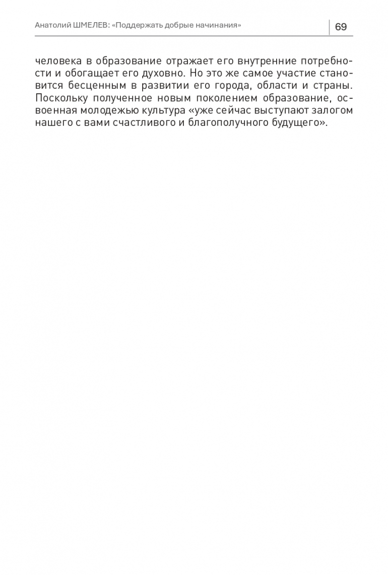 Сотрудничество Анатолия Шмелева с филиалом МГУ и образованным на его базе Ульяновским госуниверситетом простирается на более чем сорокалетний период. Все эти годы онпридерживается ценности развития высшей школы, претворяет ее в жизнь своими поступками. В его понимании, вклад человека в образование отражает его внутренние потребности и обогащает его духовно. Но это же самое участие становится бесценным в развитии его города, области и страны. Поскольку полученное новым поколением образование, освоенная молодежью культура «уже сейчас выступают залогом нашего с вами счастливого и благополучного будущего».