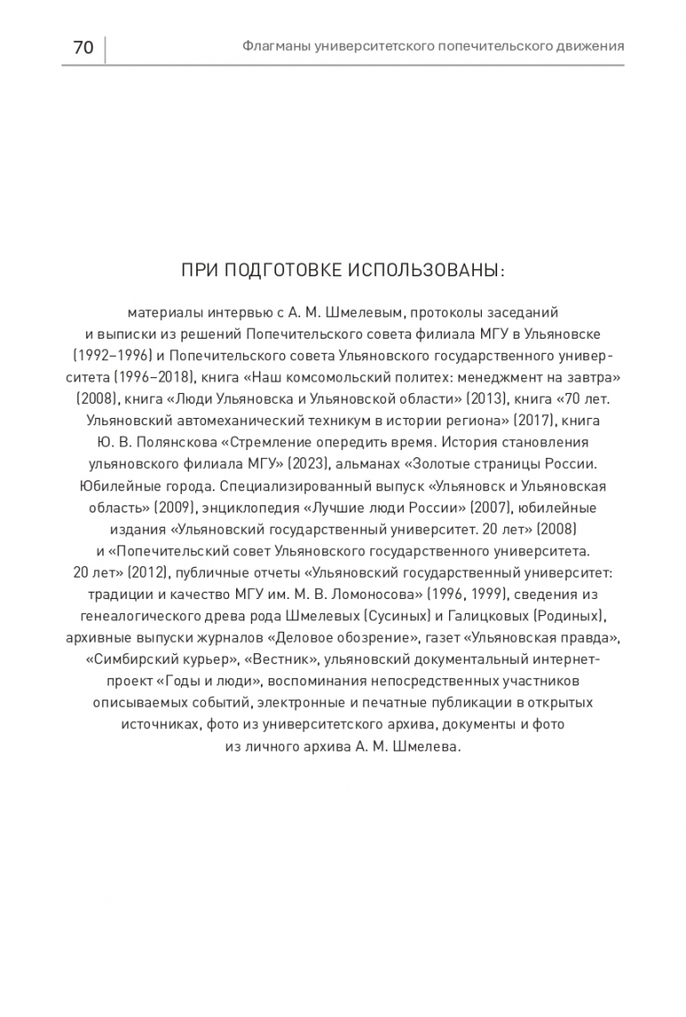 материалы интервью с А. М. Шмелевым, протоколы заседаний и выписки из решений Попечительского совета филиала МГУ в Ульяновске(1992−1996) и Попечительского совета Ульяновского государственного университета (1996−2018), книга «Наш комсомольский политех: менеджмент на завтра»(2008), книга «Люди Ульяновска и Ульяновской области» (2013), книга «70 лет. Ульяновский автомеханический техникум в истории региона» (2017), книга Ю. В. Полянскова «Стремление опередить время. История становления ульяновского филиала МГУ» (2023), альманах «Золотые страницы России. Юбилейные города. Специализированный выпуск «Ульяновск и Ульяновская область» (2009), энциклопедия «Лучшие люди России» (2007), юбилейные издания «Ульяновский государственный университет. 20 лет» (2008) и «Попечительский совет Ульяновского государственного университета. 20 лет» (2012), публичные отчеты «Ульяновский государственный университет: традиции и качество МГУ им. М. В. Ломоносова» (1996, 1999), сведения из генеалогического древа рода Шмелевых (Сусиных) и Галицковых (Родиных), архивные выпуски журналов «Деловое обозрение», газет «Ульяновская правда»,«Симбирский курьер», «Вестник», ульяновский документальный интернет-проект «Годы и люди», воспоминания непосредственных участников описываемых событий, электронные и печатные публикации в открытых источниках, фото из университетского архива, документы и фото из личного архива А. М. Шмелева.