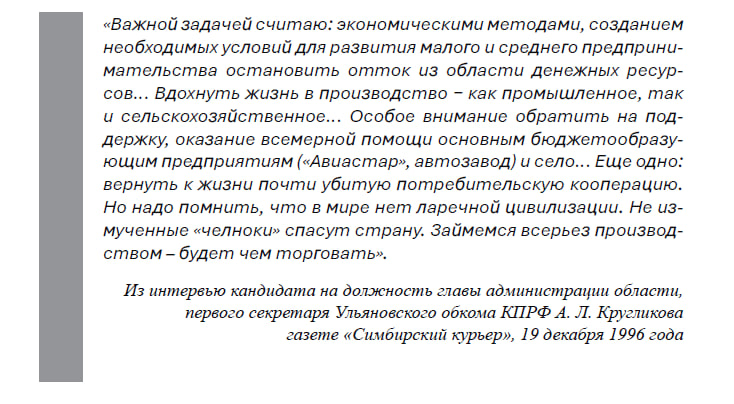 По окончании выборов 1996 года дополнительное напряжение возникает и в стенах ульяновского Белого дома. На недоброе настроение главы области указывают неожиданные упреки подчиненным, выразительные взгляды во время их докладов, отказ некоторым из них в аудиенции. В такой накаленной обстановке даже самые опытные чиновники задумываются о будущем курируемого направления и о своей дальнейшей судьбе.