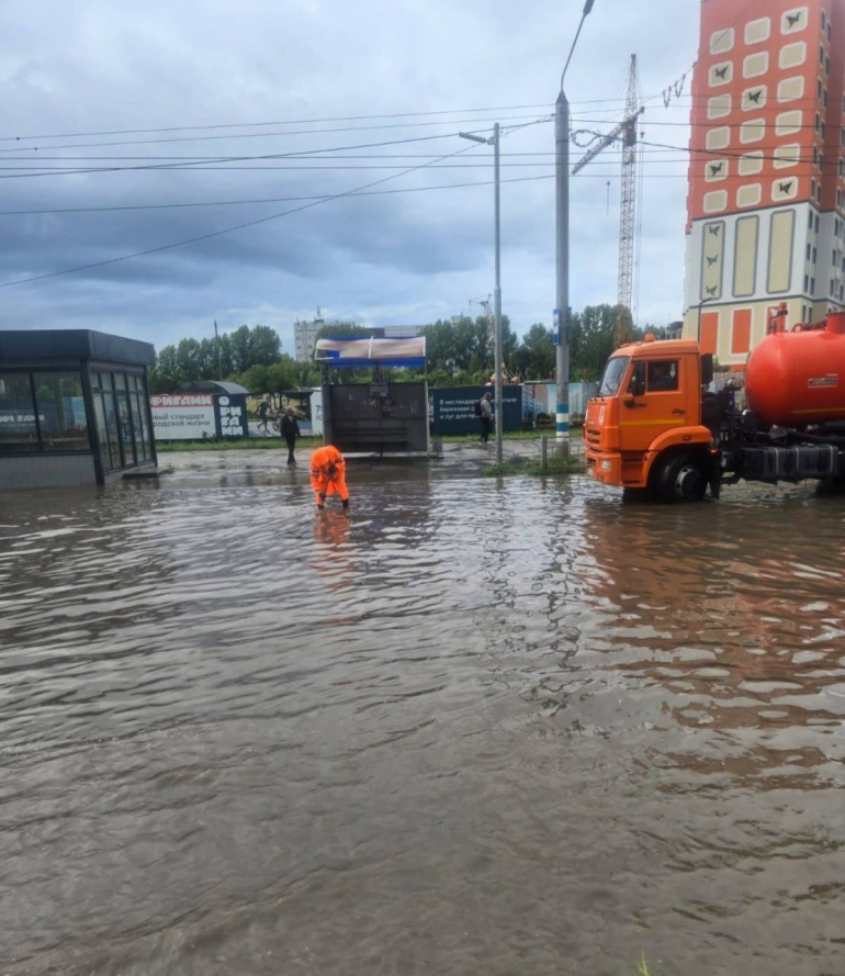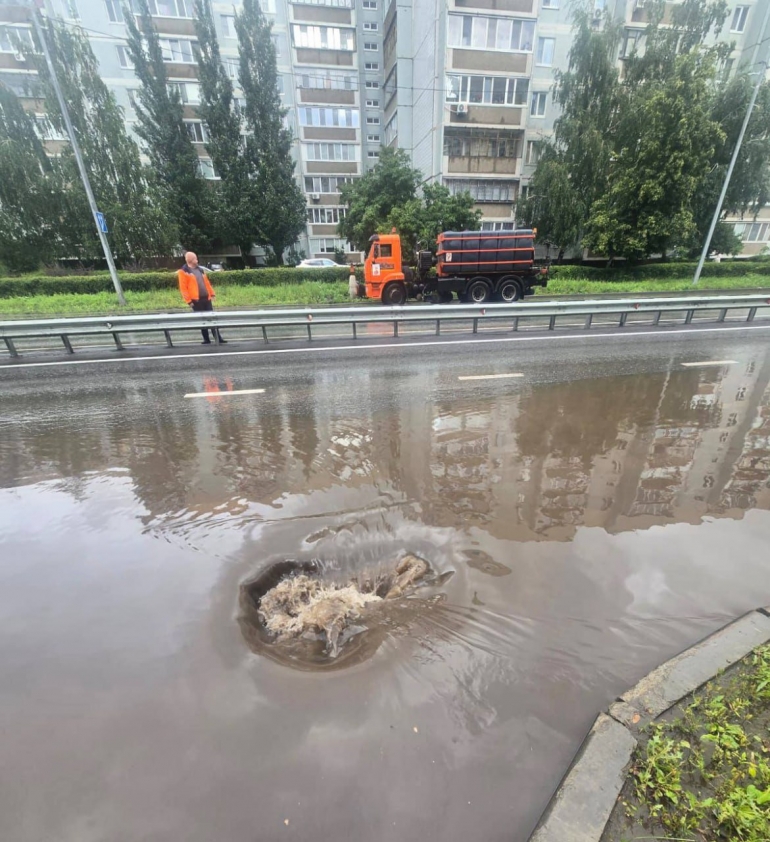 После ливня в Левобережье оперативно убирают скопления воды на проезжей части.