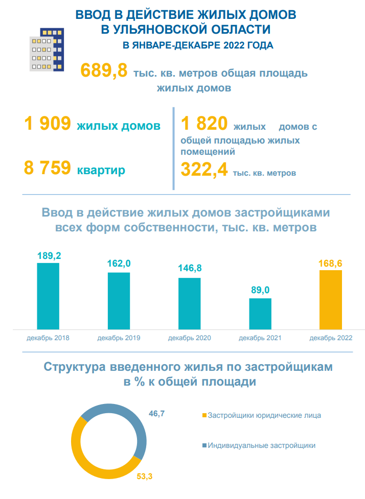 За 2022 год на территории области сдано в эксплуатацию 1 909 жилых домов (8 759 квартир) общей площадью 689,8 тыс. кв. метров, что составило 80,4% к уровню января-декабря 2021 года.