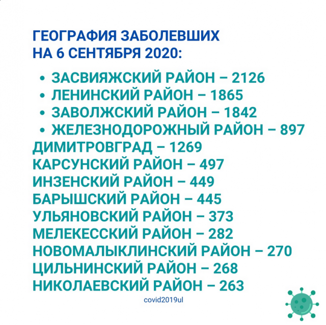 Согласно данным Центра гигиены и эпидемиологии в Ульяновской области на 6 сентября, за минувшие сутки в регионе лабораторно подтверждено 97 случаев COVID-19.