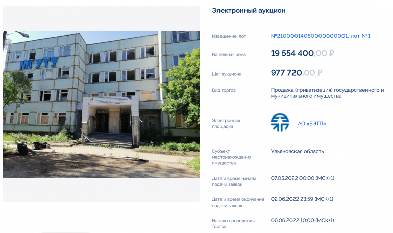 Соотвествующий аукцион был размещен на ГИС "Торги", но признан не состоявшимся из-за отсутствия участников. Уступить в цене будущему покупателю были готовы на 977,7 тысяч рублей.