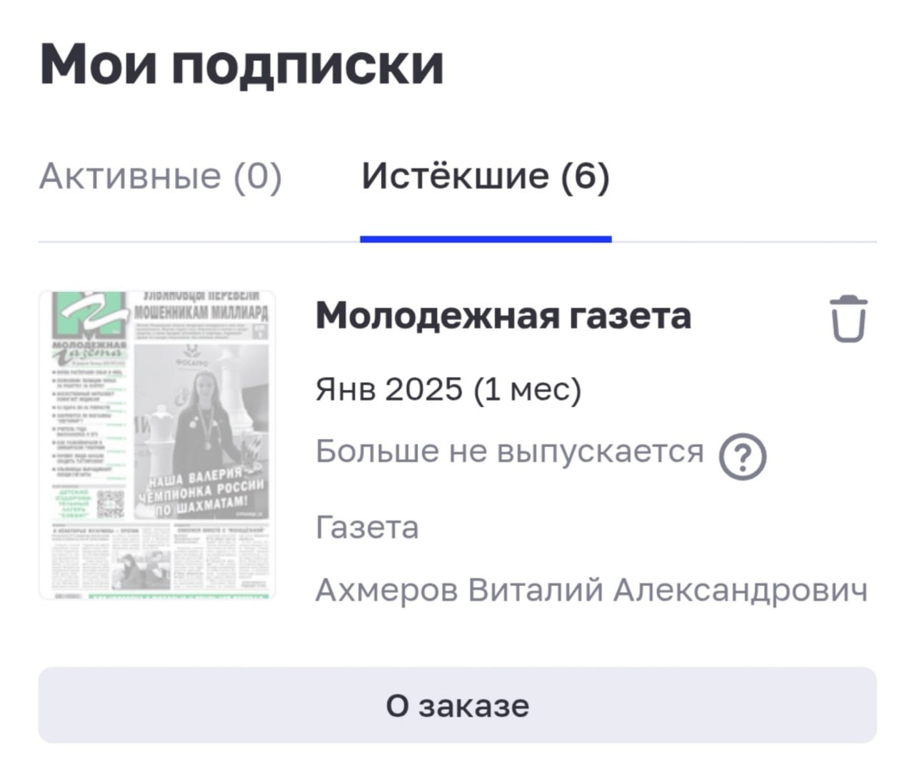 Автор телеграм-канала «Симбирский шугожор» Виталий Ахмеров утром заметил, что больше не может оформить подписку на «Молодёжку» через онлайн-сервис: «Написано, что издание больше не выпускается».