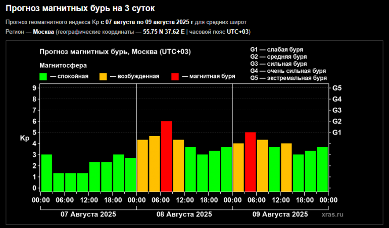 Пик геомагнитной активности придется на пятницу, 8 августа. В этот день специалисты прогнозируют магнитную бурю мощностью до 6 баллов. В субботу в регионе будут ощущаться магнитные бури силой 4-5 баллов.