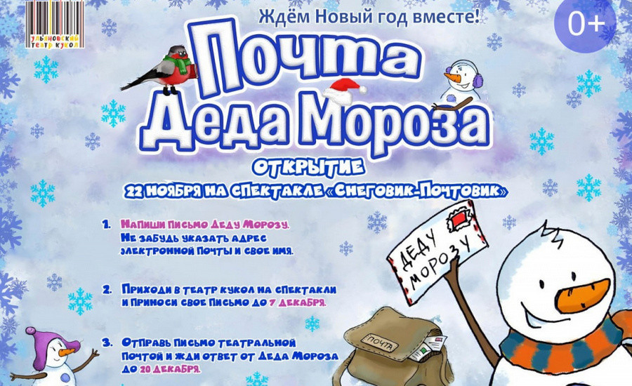 22 ноября на сцене Ульяновского театра кукол представят спектакль «Снеговик-почтовик». Дед Мороз поприветствует зрителей и начнёт принимать письма. Ребята смогут отдать письмо Деду Морозу лично или воспользоваться театральной почтой.