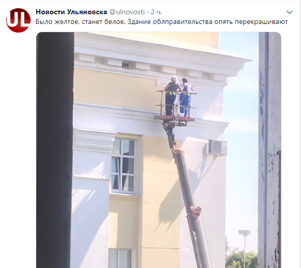 В Ульяновске здание регионального правительства поменяет окраску с желтого на белое – маляры уже начали работу. Соответствующее фото появилось в твиттер-аккаунте портала "Улновости".