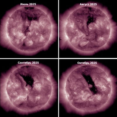 — Корональные дыры — одни из самых долгоживущих объектов на Солнце. Так как Солнце при наблюдении с Земли совершает полный оборот вокруг оси примерно за 27 суток, то образующиеся на нём корональные дыры с таким же шагом, примерно равным месяц, возвращаются к Земле, — сообщили ученые.