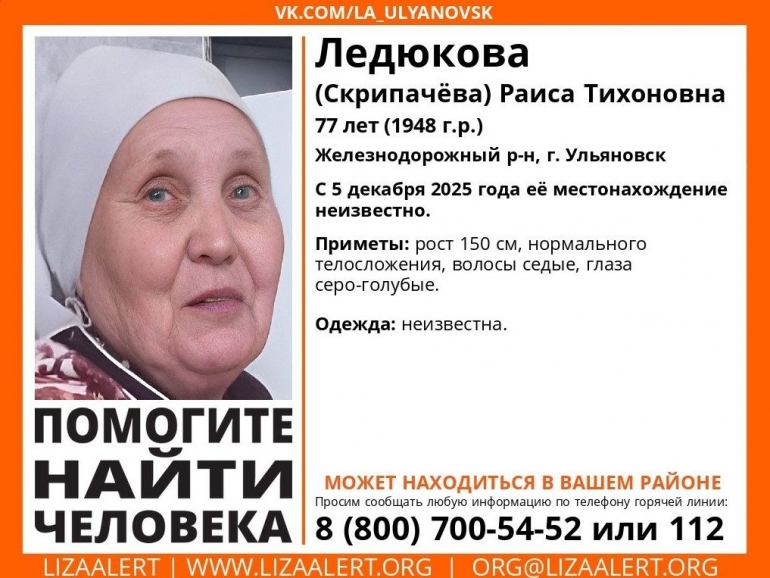 В Железнодорожном районе Ульяновска 5 декабря пропала 77-летняя местная жительница Раиса Ледюкова (Скрипачëва).