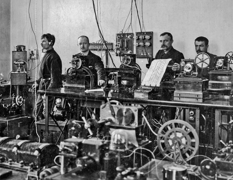 150 человек, 500 электромоторов. При каждом разрыве цепи высокого напряжения 300-киловаттный искровой передатчик гремел, как пушка. Шум и треск на станции был столь интенсивен, что персонал общался исключительно жестами. Боли в ушах и голове потом не проходили годами.