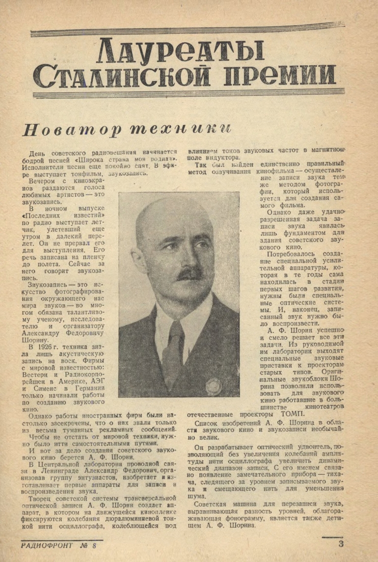Прижизненная статья об Александре Шорине в журнале Радиофронто, № 8 за 1941 год