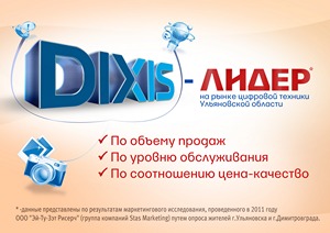 DIXIS является лидером на рынке цифровой техники города Ульяновска и Димитровграда по ряду показателей: уровень обслуживания, соотношение цена-качество, профессиональные консультации. Это подтвердило маркетинговое исследование Московского консультативного центра «Эй-Ту-Зет-Рисерч», проведенное в июле 2011 года. По результатам опроса жителей города Ульяновска и Димитровграда, специалисты выявили, что, почти каждая вторая покупка мобильного телефона или цифрового фотоаппарата была сделана в салонах DIXIS.