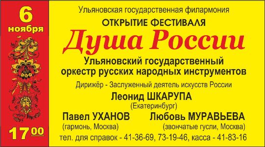 В преддверии Года культуры при поддержке Губернатора и Правительства Ульяновской области Ульяновская государственная филармония проводит крупный музыкальный проект – Региональный фестиваль народной музыки «Душа России», задача которого дать возможность жителям Ульяновской области соприкоснуться с творчеством лучших российских исполнителей на народных инструментах и исполнителей русской народной песни. Большинство концертов фестиваля пройдет для жителей сельских населенных пунктов области.