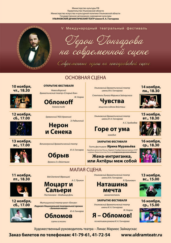 Осень, Гончаров и Фестиваль – для Симбирска и Ульяновского драматического театра им. И. Гончарова эти три составляющих верный признак того, что на сцене симбирской драмы вновь будут звучать бессмертные тексты великого романиста-гуманиста, радоваться, переживать и страдать его герои, а в зрительном зале станет свешать свою благоговейную и благодатную работу одна большая душа, впитавшая души тех, для кого романы Гончарова не просто лекарство от осенней хандры. Меньше месяца остается до того дня, когда в симбирской драме встретятся герои романов нашего великого земляка Ивана Гончарова, чье имя носит Ульяновский драматический и в год 200-летия со дня рождения которого совсем скоро войдет Россия. Впрочем, на сей раз не только они, но и персонажи бессмертных произведений Грибоедова, Пушкина, Чехова. Будут и спектакли современных авторов от Эдварда Радзинского до Михаила Угарова и Ярославы Пулинович. С 10 по 16 ноября в Ульяновском драматическом театре на двух сценических площадках одновременно состоится ставший уже традиционным Международный театральный фестиваль «Герои Гончарова на современной сцене». Он необычен, во-первых, потому что юбилейный – пятый по счету. И во-вторых, хотя международным ульяновский театральный форум был и в прошлом году, благодаря участию театральной труппы из Германии, но по-настоящему глобально и с размахом Международным фестивалю предстоит стать именно в этом году.