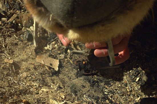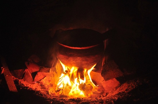 Вторая проблема - это тяга. Как только костёр немного затухал, накапливалось неимоверное количество дыма. Тяга создавалась за счёт того, что мы держали дверь в жилище чуть приоткрытой.