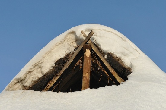 Крыша жилища - четырёхскатная с дымоходом. Сделана из брёвен, а сверху задернована.