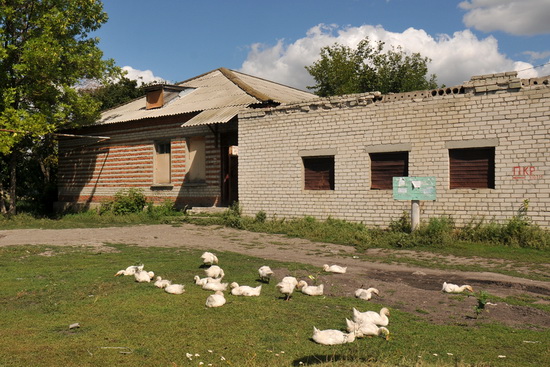 На заросших бурьяном (выше автомобиля) улицах, типичная картина умирающих сел: разваливающиеся дома, безлюдье, запустение.