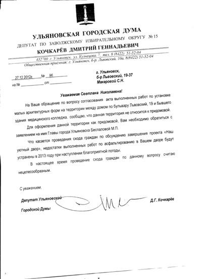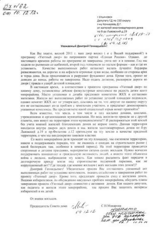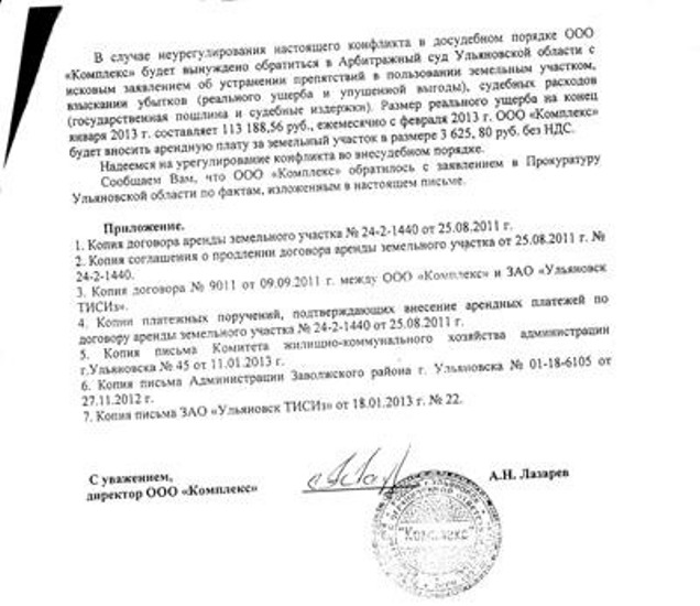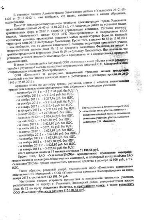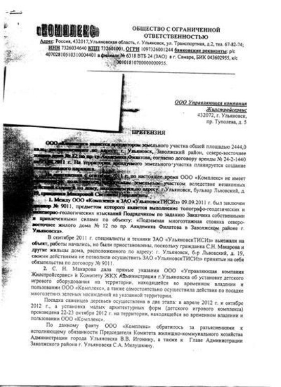 ООО «Комплекс» прислало в УК «Жилстройсервис» претензию на имя Светланы Макаровой. В ней компания пишет, что они не имеют возможности пользоваться арендуемым земельным участком из-за незаконных действий старшей по дому – она вместе с жильцами в сентябре 2011 года не дала произвести топографо-геодезические и инженерно-геологические изыскания компании-подрядчику ЗАО «УльяновскТИСИз». Кроме этого, указано, что «территория, на которой установили детскую площадку, не входит в границы придомовой территории, и установка была произведена не в соответствии с проектной документацией».