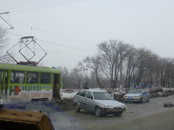 Происшествие с участием двух автомобилей - «двенашки» и Мицубиси - парализовало движение в сторону Киндяковки не только автотранспорта, но и трамваев. От сильного удара иномарку развернуло и выбросило на трамвайные пути.