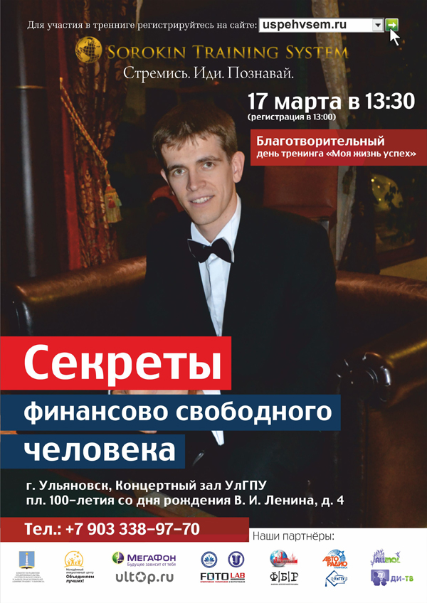 Об этом Вы сможете узнать напрямую от автора обучающей системы Александра Сорокина и его партнера по сцене долларового миллионера Алексея Потехи на БЛАГОТВОРИТЕЛЬНОМ мастер-классе в Ульяновске.