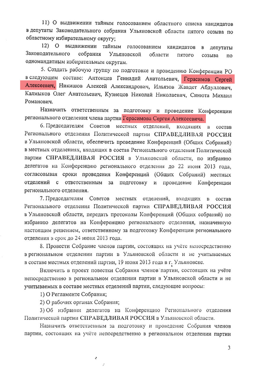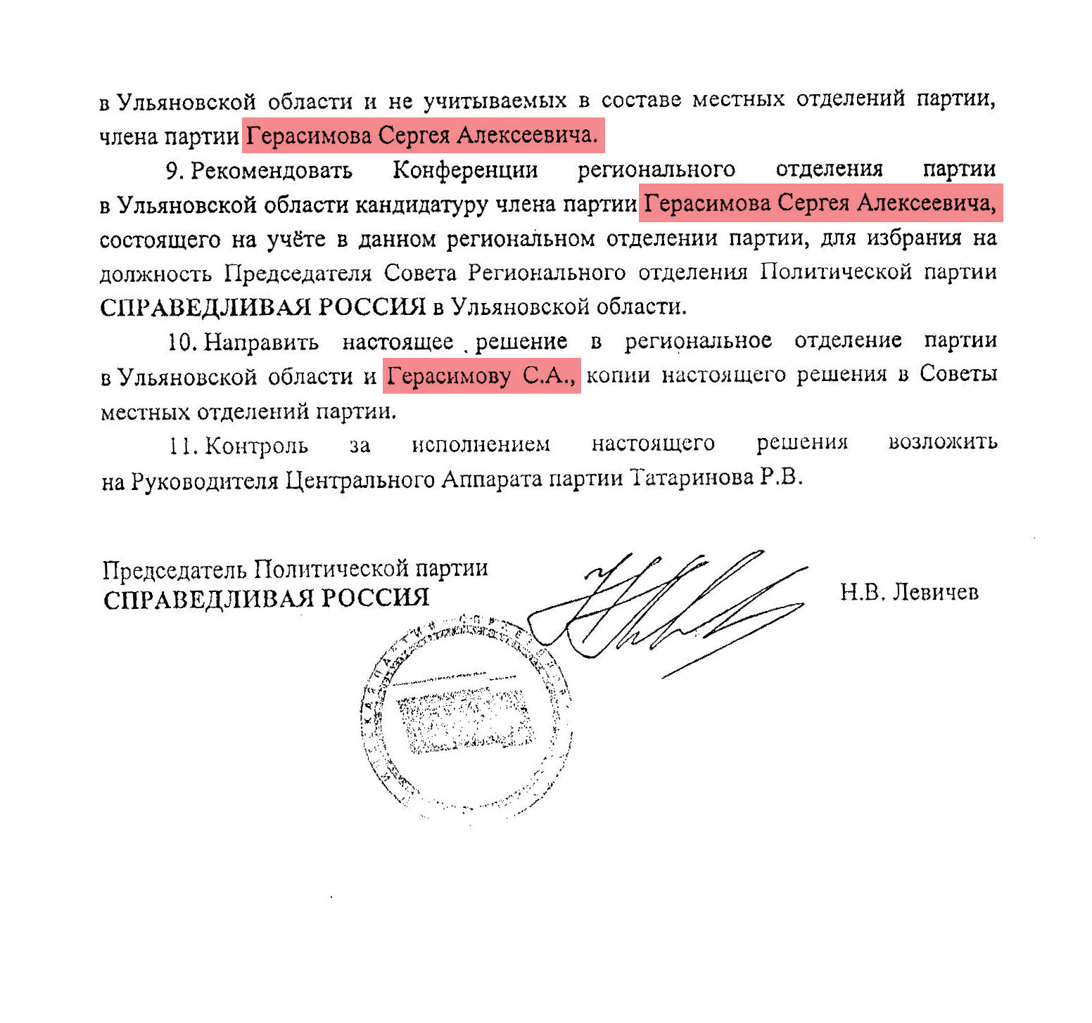 Походит к логическому финалу не очень длинная, местами скандальная история партии «Справедливая Россия» в Ульяновской области. В распоряжение портала попал крайне любопытный документ. Он именуется решением президиума Центрального Совета Политической партии «Справедливая Россия» от 11 июня 2013 года. Подписан Председателем ПП СР Н.В. Левичевым. Это документ о крахе. О позорной капитуляции. О поражении партии и в целом, и в отдельно взятой Ульяновской области. В документе предписывается прекратить полностью деятельность отделений «СР» в Радищевском, Базарносызганском, Вешкаймском, Цильнинском, Чердаклинском, Теренгульском, Майнском, Николаевском, Сурском районах, в Новоульяновске и Сенгилее. Почти полностью ликвидируются отделения эсеров в Новомалыклинском районе (со 2-го по 6-е), в Карсунском районе (с №1 по №35), в Димитровграде (5 штук), в Заволжском районе Ульяновска (16 штук). Полностью закрываются отделения в Железнодорожном и Засвияжском районах г. Ульяновска. Это кадровая бездна. Паника, чума. Не остается почти ничего, полный разгром! А то, что остается, теперь будет судорожно собирать под свои сомнительные «знамена» господин Герасимов. Именно ему, среди прочих, партийный лидер Левичев поручил «создать Рабочую группу по подготовке и проведению Конференции Регионального отделения партии». Эту «Конференцию позора» и капитуляции предписано собрать 29 июня. Ну а главное – как мы и предсказывали, господин Герасимов официально назначается партийным лидером эсеров в регионе! Капитаном тонущего баркаса…