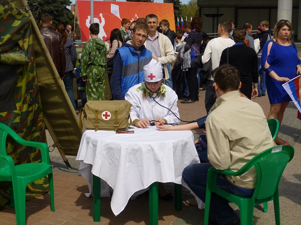 У Ленинского мемориала также гуляло немало народа: здесь сестры милосердия меряли всем желающим давление, можно было поупражняться в стрельбе, а местные граффити-мастера создавали праздничный плакат.