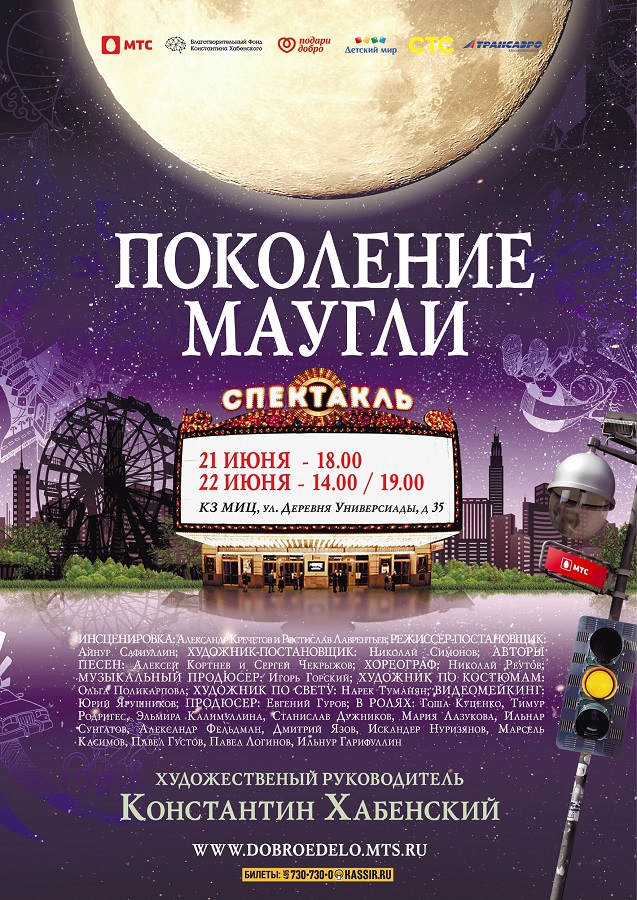 Стартовали продажи билетов на всероссийскую премьеру благотворительного музыкального спектакля «Поколение Маугли» Константина Хабенского с участием широкого круга звезд российского кино и театра (К. Хабенский, А. Кортнев, Э. Калимуллина, Т. Родригез) и воспитанников детских театральных студий в Казани. Премьерные спектакли пройдут в Казани 21-22 июня 2014 года в концертном зале Международного информационного центра. Все собранные средства от продажи билетов на спектакли «Поколение Маугли» направляются на лечение детей в рамках всероссийского благотворительного проекта МТС и Благотворительного фонда Константина Хабенского.