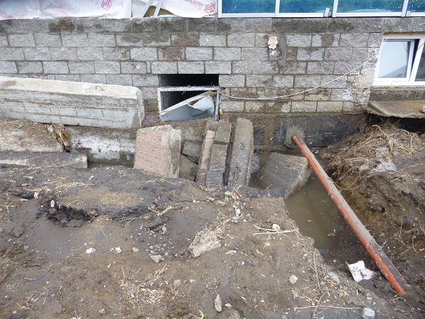 В зоне затопления оказались не только улицы и тротуары, но и подвалы зданий. Строящаяся клиника на Филатова пострадала очень сильно: полностью затопило подвал, бетонные блоки под мощными струями воды завалили вход в него.